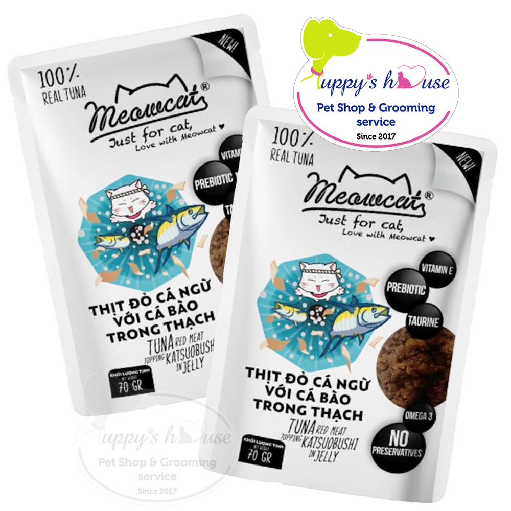 Meowcat – vị thịt đỏ cá ngừ với cá bào trong thạch là thức ăn hỗn hợp hoàn chỉnh dạng ướt, dành cho mèo trên 3 tháng tuổi.